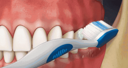 刷牙時豎向刷或者小范圍震顫刷,將刷毛向牙齦處輕壓,貼近牙面,兩顆兩顆來回震顫刷。此動作可以讓刷毛深入刷到牙齦溝里面,清潔牙齒與牙周部分。