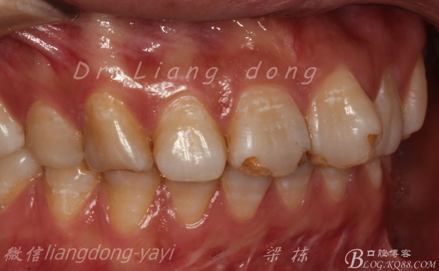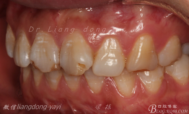 牙冠顏色暗黃,排列亦略有不齊,門(mén)牙扭轉(zhuǎn)、鄰面舌側(cè)齲壞。